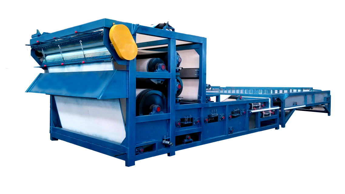 帶式壓濾泥漿脫水機(jī)是洛陽隆中重工在引進(jìn)國外壓濾技術(shù)基礎(chǔ)上研制成功的新機(jī)型,該設(shè)備是通過兩條濾帶纏繞在一系列順序排列、大小不等的輥輪上,利用濾帶間的擠壓和剪切作用,來脫除料漿中水分的一種壓濾設(shè)備,具有著能連續(xù)作業(yè)、自動化程度高、節(jié)能、使用維護(hù)方便等優(yōu)點(diǎn),是一種進(jìn)行污泥脫水減量化處理的理想設(shè)備。